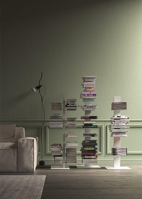 Si può scegliere l’elemento da fissare a parete o tra le quattro misure degli elementi autoportanti e quindi liberamente collocabili in qualsiasi ambito della casa.