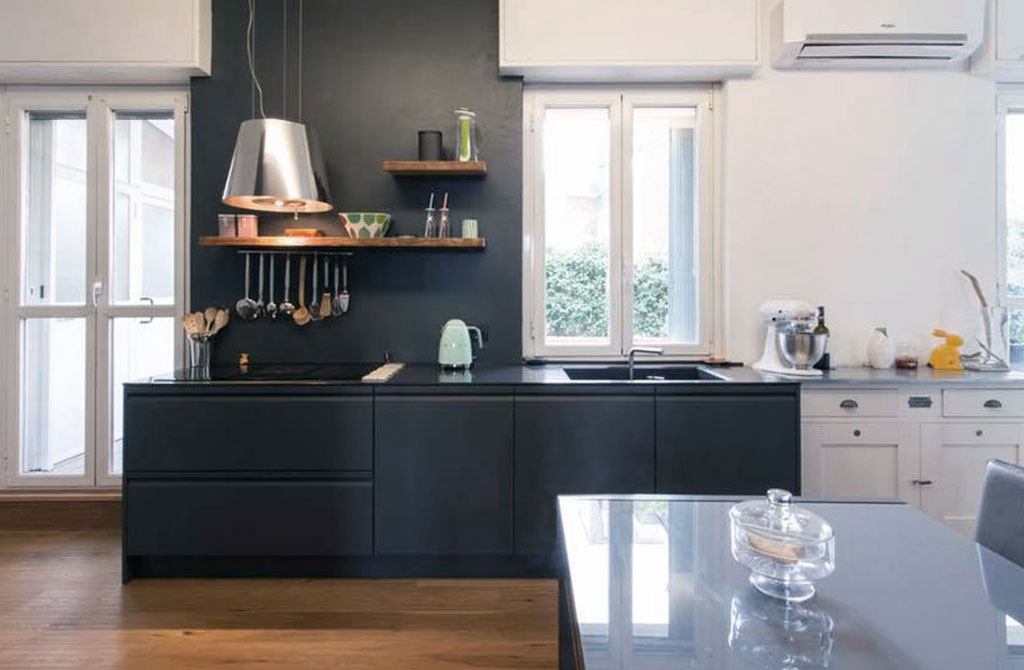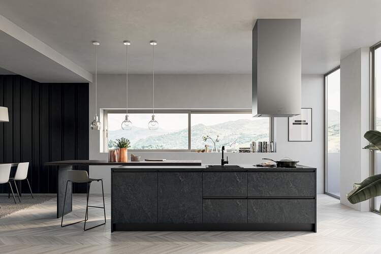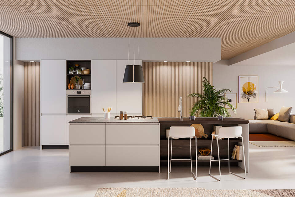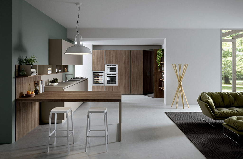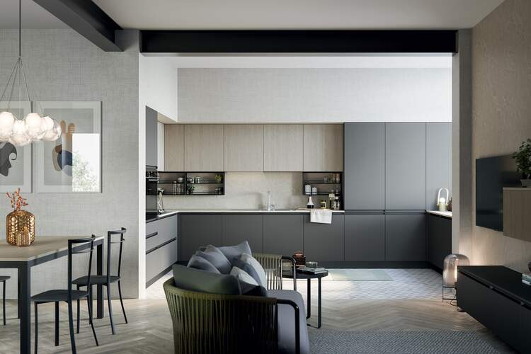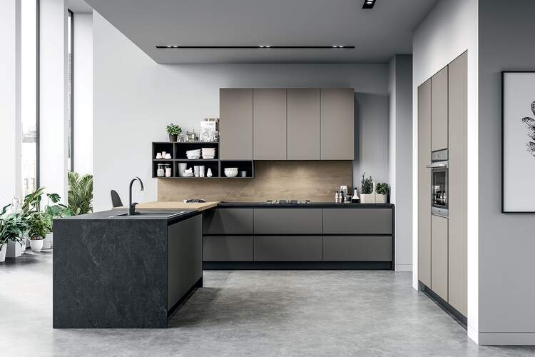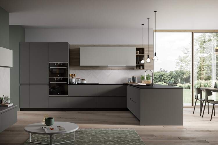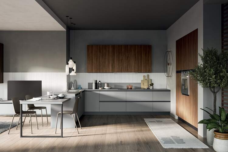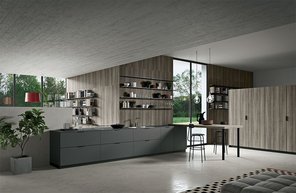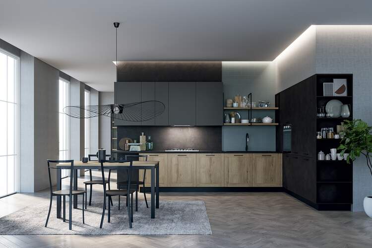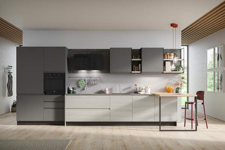Con Noah di Prima Cucine investi sulla cucina in modo intelligente perché spendi un po’ di più per ottenere molto di più. Primo passo, i materiali: l’anta a telaio dallo stile industriale ha il pannello in massello, rovere o frassino. È una sicurezza per la solidità e la durata. D’altro canto la maniglia è risparmiata, sostituita dalla presa integrata nell’anta. In questo modo ottieni cucine dallo stile lineare e industrial.