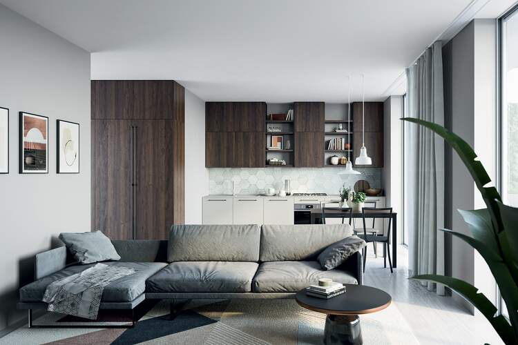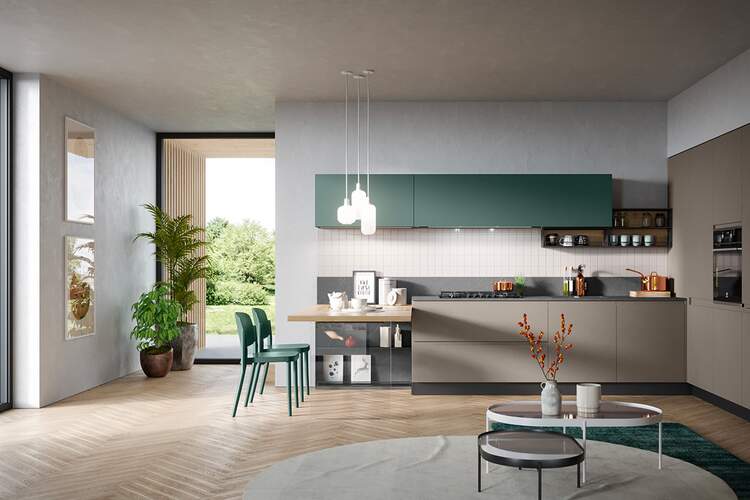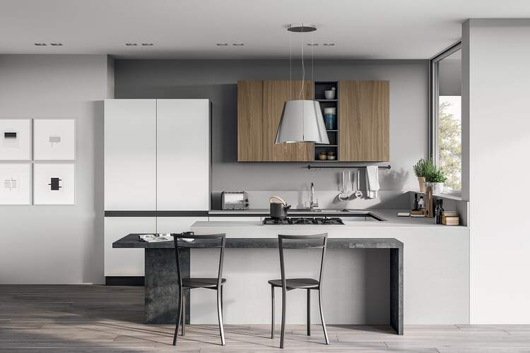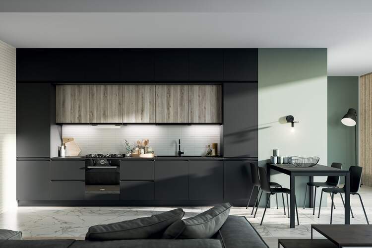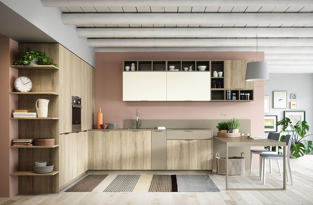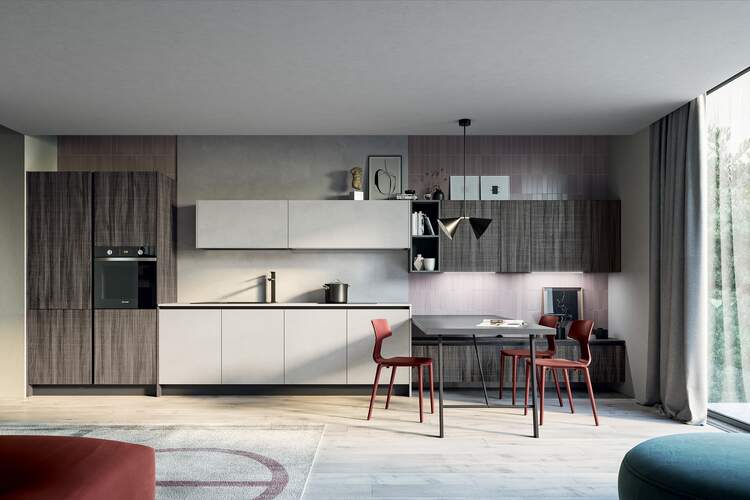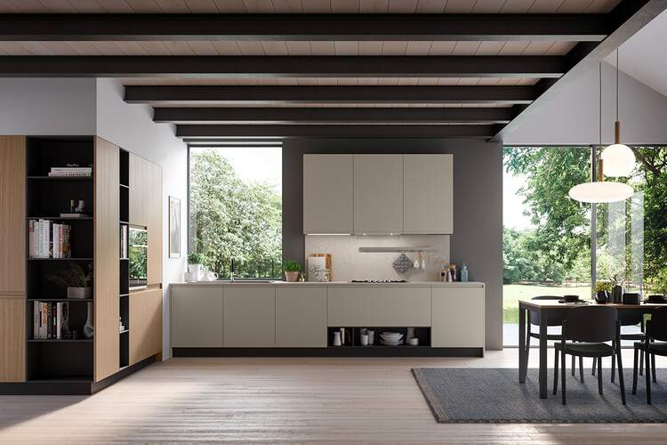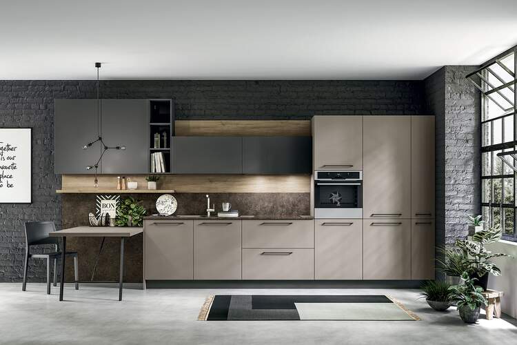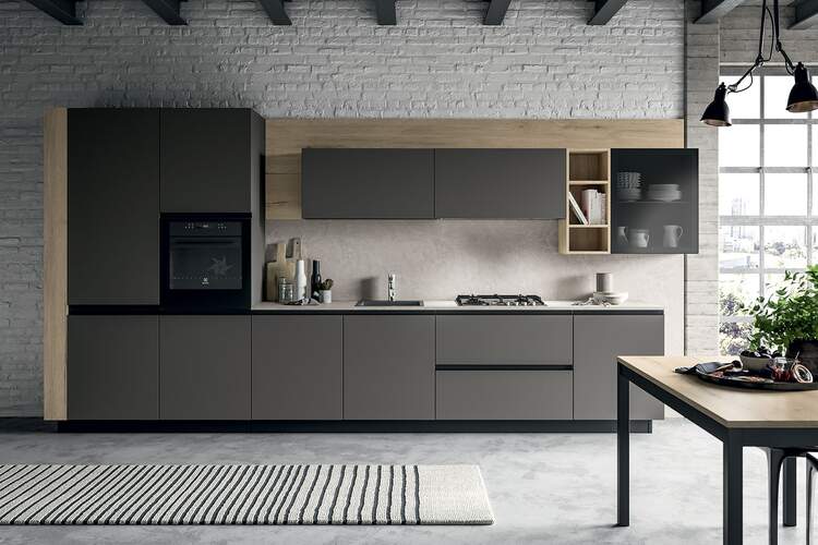 Zoe di Prima Cucine ha un’estetica lineare e minimalista, mai banale, e un prezzo competitivo. È costruita in melaminico, resistente oltre che economico, con finiture lisce opache o con venature effetto legno. La sua anta è liscia con un sistema di apertura effetto gola, posto in orizzontale, ottenuto con un profilo metallico integrato nell’anta.